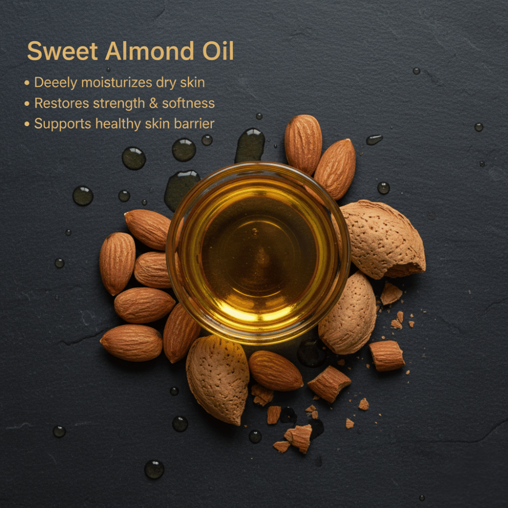 - Sweet Almond Oil – Softens coarse hair and smooths dry, irritated skin.